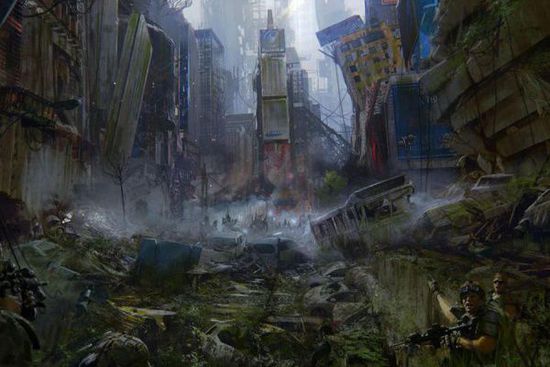 图中显示了工业文明发展到极致的情景,巨大的金属世界"笼罩"着纽约时代广场,似乎未来并不是这样的,但艺术家认为随着工业文明的推进,城市将被更多的金属所"占领",如果用乌托邦来形容未来美好的城市生活,那么这一幕应该算是反乌托邦的情景,巨大的工业时代建筑成为城市的中心地标。